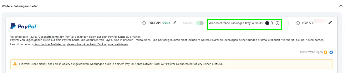 Aktiviere dazu den Toggle bei "Wiederkehrende Zahlungen (PayPal Vault)"
